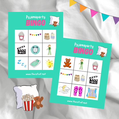 Of laat je verrassen met de ballonnen. In plaats van de activiteit op de ballon te schrijven stop je nu een briefje in de ballon. Zo is het elke keer weer een verrassing wat er nu aan de beurt is. - Speel samen een pyamaparty bingo!